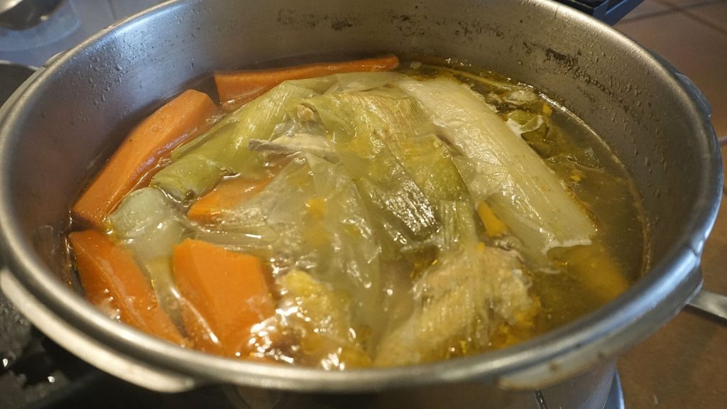 Para comenzar, usaremos la carcasa para hacer un caldo, por lo que la introduciremos en una olla con agua junto a los ingredientes que te describo en esta receta para hacer sopa de pollo. Este caldo se puede congelar y consumirlo en las semanas posteriores para sopa o para añadir a un arroz.